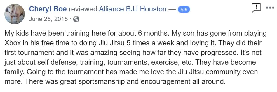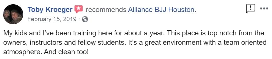 "Alliance BJJ Houston is very nice, clean, and the atmosphere is great for kids and adults."